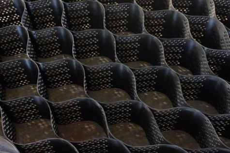 土工格室是目前国内外较为流行的一种新型的高强度土工合成材料,它是由强化的HDPE片材料,经高强力焊接而形成的一种三维网状格室结构。具有伸缩自如,运输可缩叠,施工时可张拉成网状,填入泥土、碎石、混凝土等松散物料,构成具有强大侧向限制和大刚度的结构体。